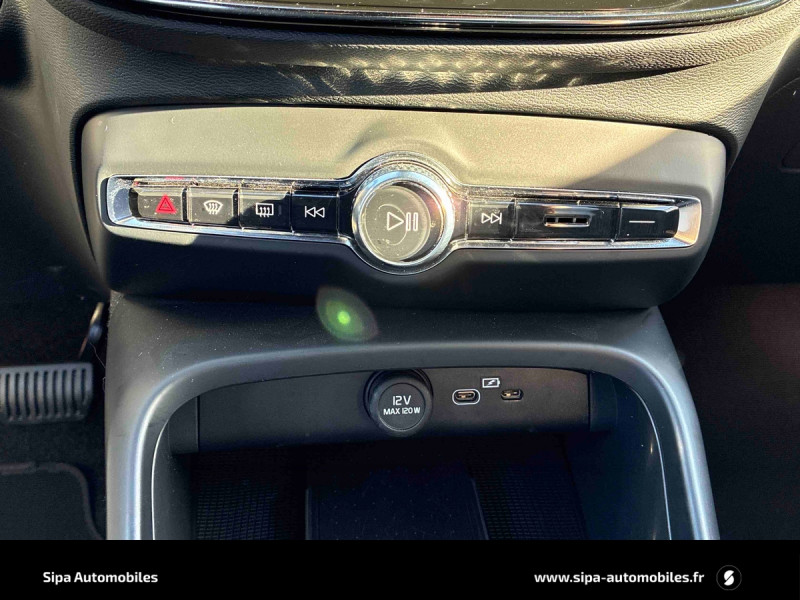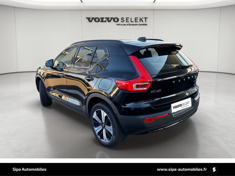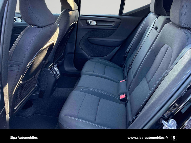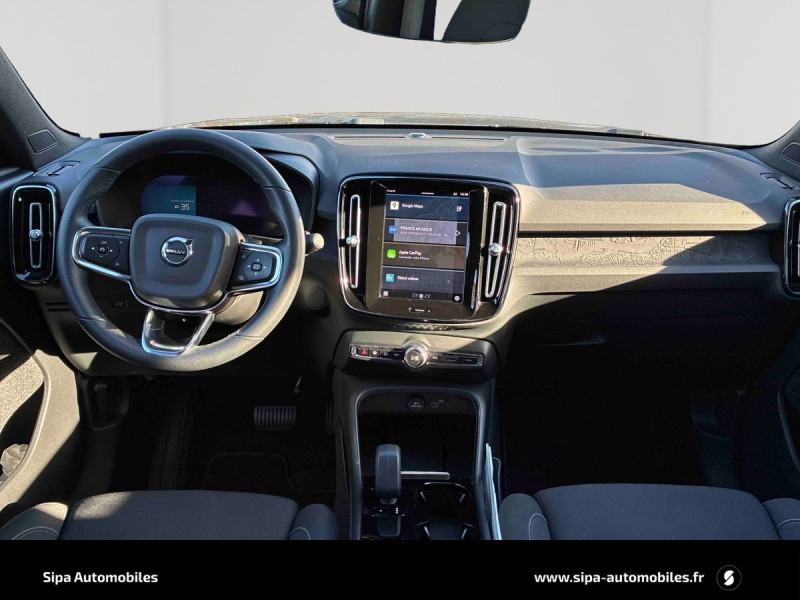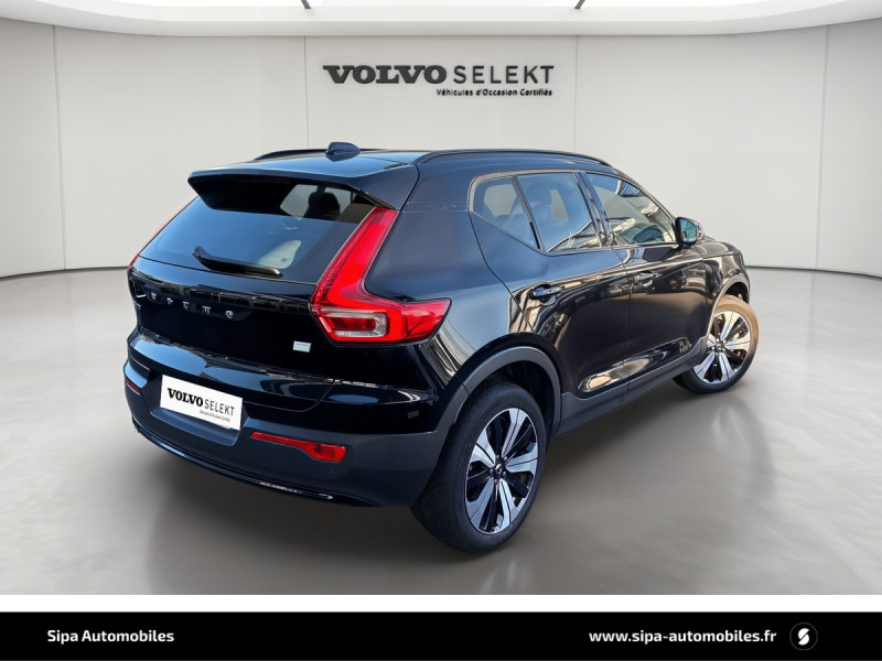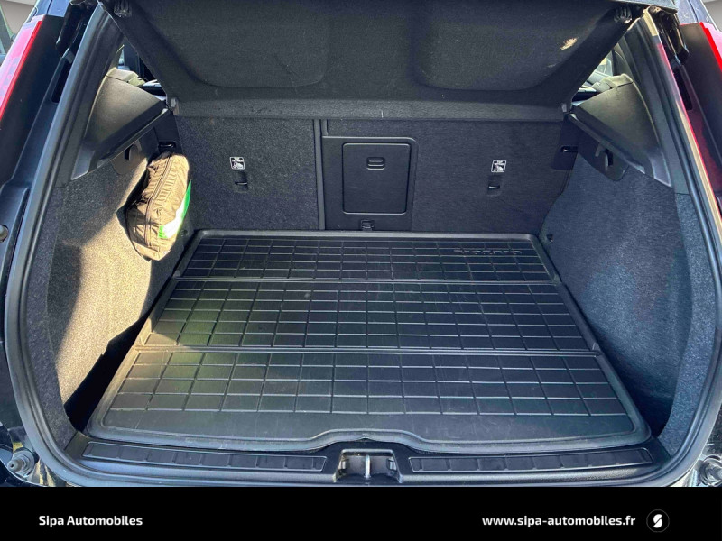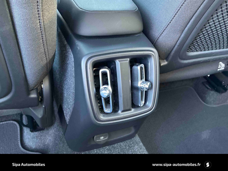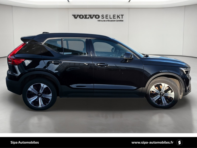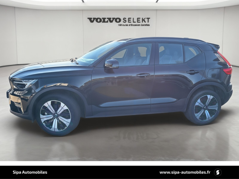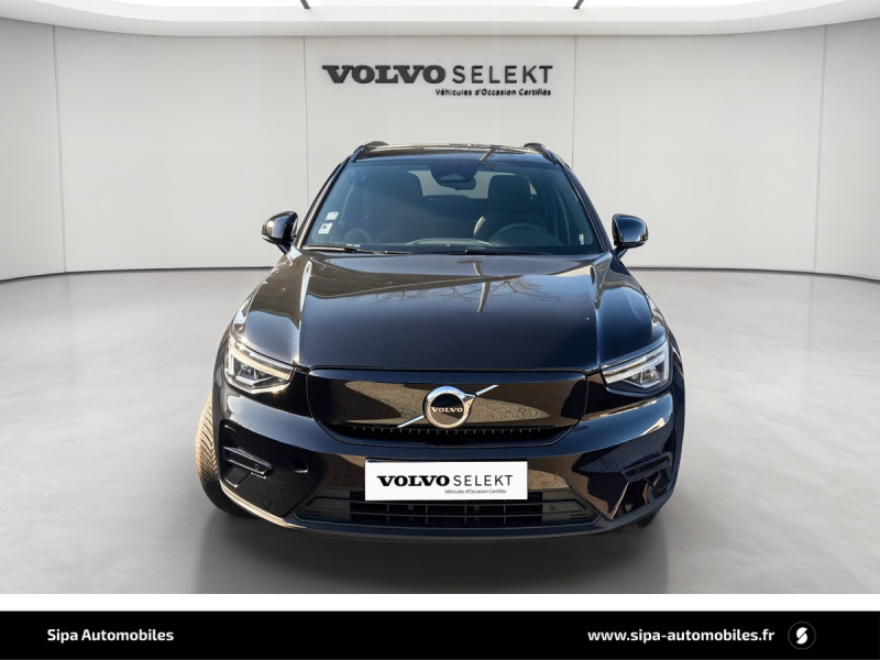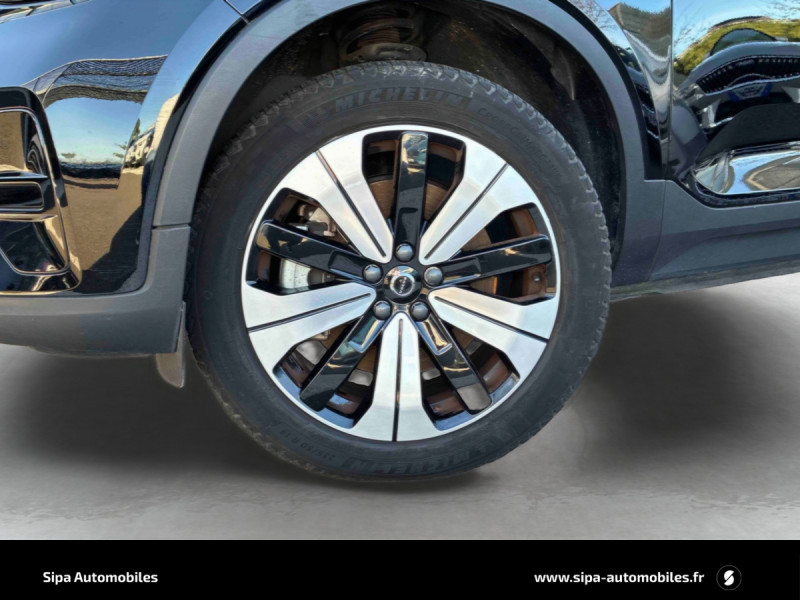 CleanZone : Filtre charbon de climatisation multi-actif (limite l'entrée de pollen, de particules de pollution et de mauvaises odeurs en fermant automatiquement les arrivées d'air si nécessaire) et fonction pré-ventillation / Climatisation automatique bi-zone (incluant ouïes d'aération à l'AR) / Déclenchement automatique des feux de detresse lors d'un freinage d'urgence / Envoi automatique d'une alerte au service d'urgence Volvo en cas de collision / Fonction climatisation de l'habitacle moteur coupé / Frein de parking électronique automatique en fonction Auto Hold (désactivable) / Freinage automatique post-collision (réduction du risque de suraccident) / Incrustations Aluminium / Jantes alliage 19" 5 branches Graphite Mat/Diamant AV 235/50 R19, AR 255/45 R19 / Phares LED avec feux de jour design marteau de Thor et feux de route adaptatifs / Pommeau de levier de vitesse gainé de Simili-Cuir / Pré-câblage électrique pour le crochet d'attelage / Seuil de coffre en Aluminium / Seuils de portes AV Volvo en Aluminium / Télécommande de verrouillage centralisé avec clé de contact intégrée, fermeture à distance des vitres et du toit ouvrant et fonction panique / Verrouillage automatique des portes à partir de 7 km/h / Volant sport avec insert Aluminium / 2 porte-cintres / Accès au service d'assistance Volvo via bouton dédié dans le plafonnier / Accès au service d'urgence Volvo via bouton SOS dans le plafonnier / Airbag passager désactivable avec témoin d'indication (on/off) / Airbags conducteur et passager à déclenchement différencié / Alerte vigilance conducteur / Application Volvo Cars sur smartphone iOS ou Android / Assise des sièges AV extensible manuellement / Assistance à l'évitement des piétons et des cyclistes / Badge Recharge sur le hayon / Bas de caisse et passages de roues Anthracite / Calandre AV pleine couleur carrosserie / Ceintures de sécuritéà inertie à 3 points d'ancrage (sur les 5 sièges) / City Safety, système d'anticipation de collision intelligent / Coffre sous le capot AV d'une capacité de 31 litres / Combiné d'instruments digital 12,3" / Contrôle de la transmission en descente HDC / Coques de rétroviseurs Noir brillant / Corbeille intégrée et amovible au niveau du tunnel central AV / Crochet pour sacs intégréà la boîte à gants / Câble de recharge de 7 mètres / 10 A. Pour prise secteur / Deuxième câble de recharge Type 2, 4.5 mètres, 32 A triphasé (fonctionne en monophasé) Pour borne de recharge / Diffuseur AR Noir laqué / Direction assistée asservie à la vitesse / Eclairage d'accompagnement et éclairage d'approche / Ecran tactile multimédia haute résolution 9" personnalisable / Espace de rangement sous la console centrale / Fonction Eco : optimisation des paramètres véhicule pour une conduite économique et écologique (à la demande) / Gravure Recharge sur les montants AR / Indicateur de perte de pression des pneus / Infotainment Google Android Services Google (comprend Google Maps, Google Assistant, Google Play Store, chargeur smartphone par induction et un volume de données illimité pour les 4 premières années) et Kit mains libres Bluetooth et Streaming Audio, mode d?emploi numérique du véhicule, réception de la radio numérique (DAB+), mises à jour Over the Air (OTA). / Kit anti-crevaison / Matériaux anti-allergènes dans l'habitacle (sellerie tissu, ceintures de sécurité, incrustations) / Miroirs de courtoisie éclairés, spots de lecture à l'AV et éclairage dans le coffre / Mise à jour du système à distance / Pare-brise en verre feuilleté et colonne de direction rétractable en cas de choc / Parties inférieures des vitres noir brillant / Pneus toutes saison / Port de recharge sur l'aile AR gauche et connecteur charge rapide (jusqu'à 150 kW) / Porte-cartes bancaires et cartes de services intégré dans la planche de bord / Protections de pare-chocs AV et AR Noir brillant / Préparation pour le système Isofix (places latérales de la 2ème rangée de sièges) / Rappel d'oubli de bouclage des ceintures de sécurité AV et AR / Réglage en hauteur manuel des ceintures AV / Rétroviseurs couleur carrosserie avec partie inférieure noir / Rétroviseurs intérieur (sans contour) et extérieur électrochrome / Sabots de protection AV et AR Noir / Siège conducteur et passager avec réglage manuel de la hauteur / Sièges conducteur et passager avec réglage manuel de la longueur, de l'inclinaison du dossier et de l'assise / Sièges conducteur et passager avec réglages électriques des supports lombaires / Sonde de température extérieure et horloge / Système audio Volvo High Performance avec technologie air woofer au niveau de la console centrale 250 W, 8 HP, radio numérique terrestre, prise 12 V et 2 ports USB C à l'AV / Système de contrôle de la stabilité et de la traction STC / Système de contrôle du freinage du véhicule VDC / Système de protection anti-sortie de route / Système de protection collision frontale : Détection du risque de collision frontale (de 65 à 140 km/h) avec action corrective sur la direction / Système de protection contre le coup du lapin WHIPS (sièges AV) / Système de protection contre les chocs latéraux SIPS / Système de protection en cas de sortie de route / Système de pré-conditionnement de l'habitacle (chauffage) / Système de réglage en hauteur des phares / Système intelligent d'information au conducteur IDIS / Tapis de sol premium / Trousse de 1er secours et triangle de présignalisation / Tunnel de la console centrale Noir brillant / Verrouillage de sécurité enfant manuel / Vitres AV et AR électriques à impulsion (montée et descente) avec système anti-pincement