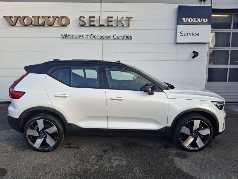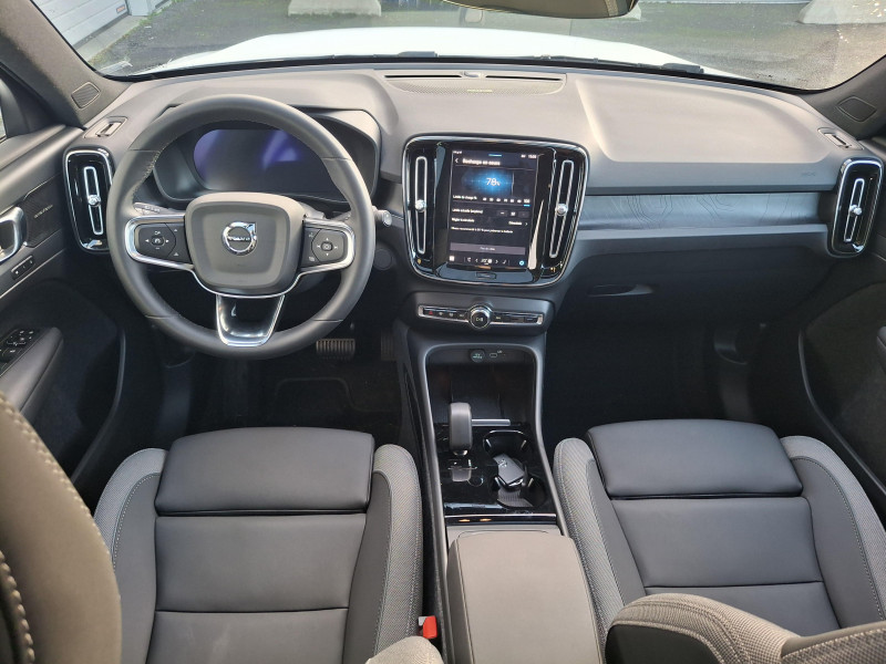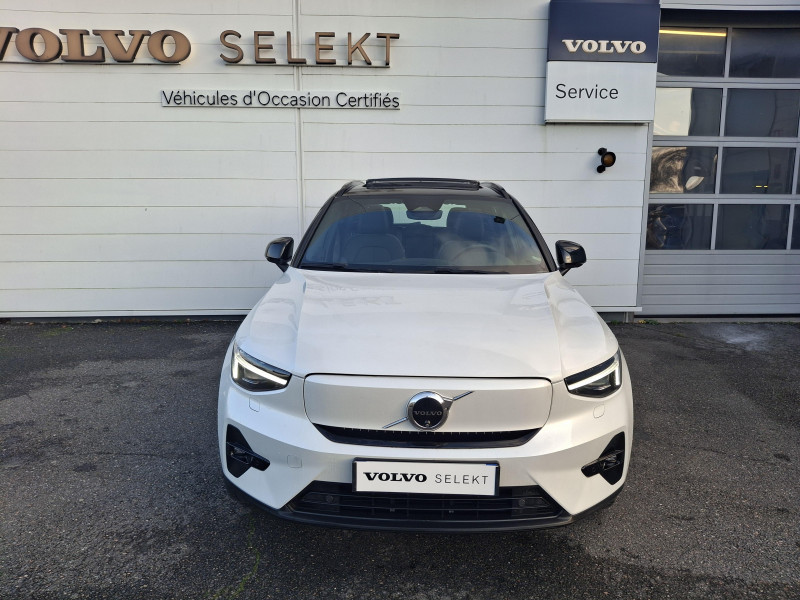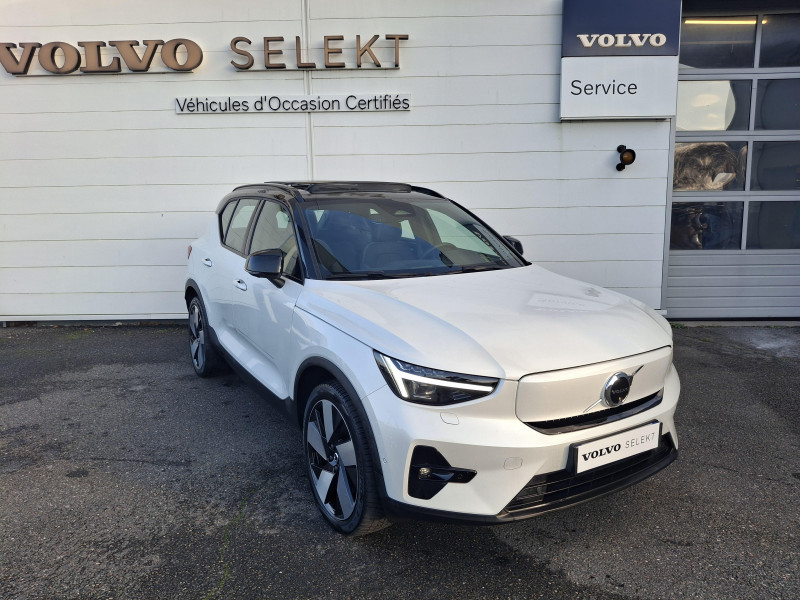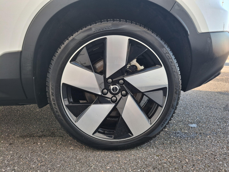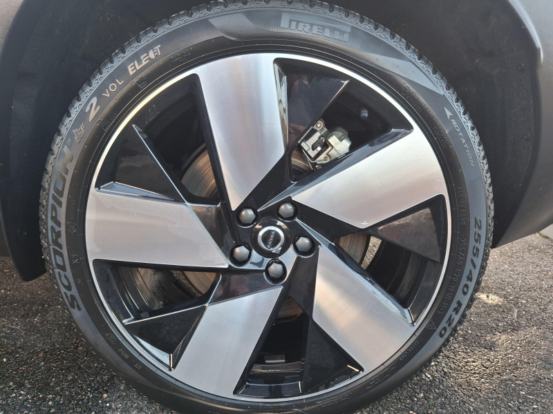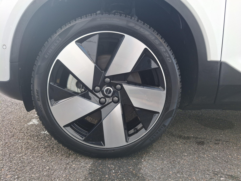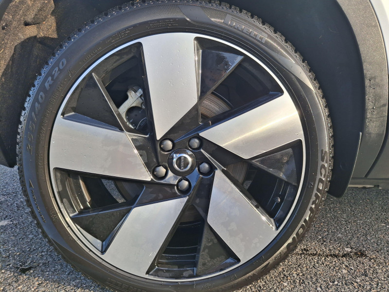 Airbag passager désactivable avec témoin d'indication (on/off) / Airbags conducteur et passager à déclenchement différencié / Application Volvo Cars sur smartphone iOS ou Android / Appuie-tête AR rabattables électriquement depuis l'écran central / Assise des sièges AV extensible manuellement / Caméras Surround View (vision panoramique à 360°) incluant caméra AV et caméra de recul / Ceintures de sécuritéà inertie à 3 points d'ancrage (sur les 5 sièges) / CleanZone : Filtre charbon de climatisation multi-actif (limite l'entrée de pollen, de particules de pollution et de mauvaises odeurs en fermant automatiquement les arrivées d'air si nécessaire) et fonction pré-ventillation / Climatisation automatique bi-zone (incluant ouïes d'aération à l'AR) / Déclenchement automatique des feux de detresse lors d'un freinage d'urgence / Ecran tactile multimédia haute résolution 9" personnalisable / Envoi automatique d'une alerte au service d'urgence Volvo en cas de collision / Filet de sécurité derrière la rangée de sièges AV / Fonction climatisation de l'habitacle moteur coupé / Frein de parking électronique automatique en fonction Auto Hold (désactivable) / Freinage automatique post-collision (réduction du risque de suraccident) / Incrustations Aluminium / Infotainment Google Android Services Google (comprend Google Maps, Google Assistant, Google Play Store, chargeur smartphone par induction et un volume de données illimité pour les 4 premières années) et Kit mains libres Bluetooth et Streaming Audio, mode d'emploi numérique du véhicule, réception de la radio numérique (DAB+), mises à jour Over the Air (OTA). / Jantes alliage 19" 5 branches Noir/Diamant AV 235/50 R19, AR 255/45 R19 / Pack Intellisafe Pro / Phares LED avec feux de jour design marteau de Thor et feux de route adaptatifs / Pommeau de levier de vitesse gainé de Simili-Cuir / Pré-câblage électrique pour le crochet d'attelage / Préparation pour le système Isofix (places latérales de la 2ème rangée de sièges) / Seuil de coffre en Aluminium / Seuils de portes AV Volvo en Aluminium / Siège conducteur électrique à mémoires / Siège passager AV à réglages électriques / Sièges conducteur et passager avec réglages électriques des supports lombaires / Système audio Volvo Premium Sound by Harman/Kardon 600 W avec 13 HP et technologie Subwoofer / Système de protection contre le coup du lapin WHIPS (sièges AV) / Toit contrasté noir (sauf teinte Argent Aurore) / Toit ouvrant panoramique en deux parties avec pare-soleil électrique / Télécommande de verrouillage centralisé avec clé de contact intégrée, fermeture à distance des vitres et du toit ouvrant et fonction panique / Verrouillage automatique des portes à partir de 7 km/h / Volant chauffant / Volant sport avec insert Aluminium / 2 porte-cintres / Accès au service d'assistance Volvo via bouton dédié dans le plafonnier / Accès au service d'urgence Volvo via bouton SOS dans le plafonnier / Alerte vigilance conducteur / Assistance à l'évitement des piétons et des cyclistes / Badge Recharge sur le hayon / Bas de caisse et passages de roues Anthracite / Calandre AV pleine couleur carrosserie / City Safety, système d'anticipation de collision intelligent / Coffre sous le capot AV d'une capacité de 31 litres / Combiné d'instruments digital 12,3" / Contrôle de la transmission en descente HDC / Coques de rétroviseurs Noir brillant / Corbeille intégrée et amovible au niveau du tunnel central AV / Crochet pour sacs intégréà la boîte à gants / Câble de recharge Type 2, 4.5 mètres, 32 A triphasé (fonctionne en monophasé) Pour borne de recharge / Diffuseur AR Noir laqué / Direction assistée asservie à la vitesse / Eclairage d'accompagnement et éclairage d'approche / Espace de rangement sous la console centrale / Freins à disques 18" à l'AR / Gravure Recharge sur les montants AR / Indicateur de perte de pression des pneus / IntelliSafe Assist / IntelliSafe Surround / Kit anti-crevaison / Lave-phares à haute pression escamotables / Miroirs de courtoisie éclairés, spots de lecture à l'AV et éclairage dans le coffre / Mise à jour du système à distance / Ouverture des portes sans clé Keyless Entry Eclairage du sol dans les poignées de porte AV + Hayon électrique avec fonction Confort (sans les mains) / Pare-brise en verre feuilleté et colonne de direction rétractable en cas de choc / Parties inférieures des vitres noir brillant / Plancher du coffre rabattable avec crochets / Pneus toutes saison / Pompe à chaleur / Port de recharge sur l'aile AR gauche et connecteur charge rapide (jusqu'à 200 kW) / Porte-cartes bancaires et cartes de services intégré dans la planche de bord / Protections de pare-chocs AV et AR Noir brillant / Rappel d'oubli de bouclage des ceintures de sécurité AV et AR / Réglage en hauteur manuel des ceintures AV / Rétroviseurs couleur carrosserie avec partie inférieure noir / Rétroviseurs intérieur (sans contour) électrochrome / Sabots de protection AV et AR Noir / Sonde de température extérieure et horloge / Système de contrôle de la stabilité et de la traction STC / Système de contrôle du freinage du véhicule VDC / Système de protection anti-sortie de route / Système de protection collision frontale : Détection du risque de collision frontale (de 65 à 140 km/h) avec action corrective sur la direction / Système de protection contre les chocs latéraux SIPS / Système de protection en cas de sortie de route / Système de pré-conditionnement de l'habitacle (chauffage) / Système de réglage en hauteur des phares / Système intelligent d'information au conducteur IDIS / Tapis de sol premium / Trousse de 1er secours et triangle de présignalisation / Tunnel de la console centrale Noir brillant / Verrouillage de sécurité enfant manuel / Vitres AV et AR électriques à impulsion (montée et descente) avec système anti-pincement
