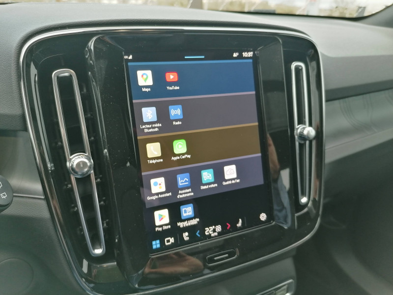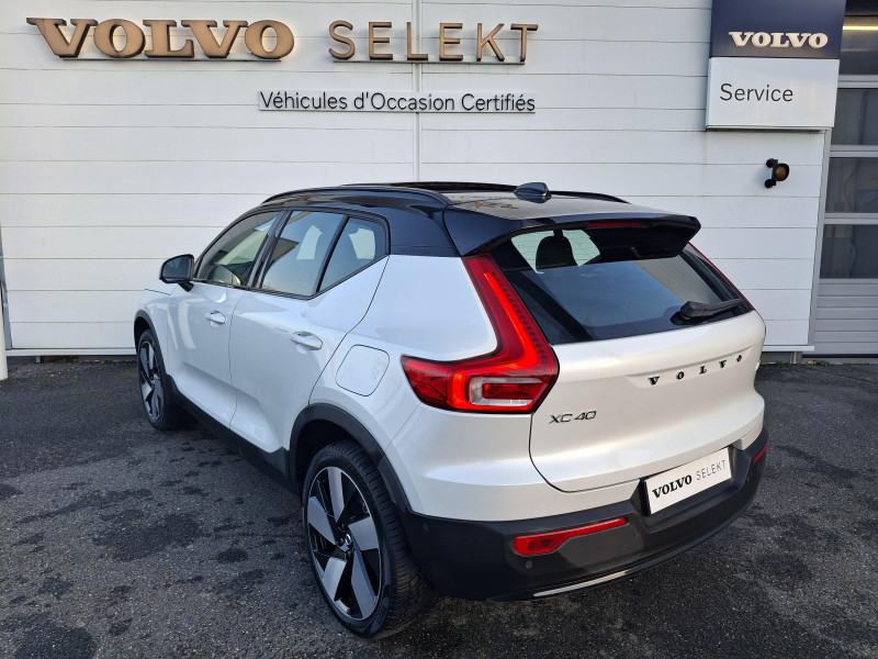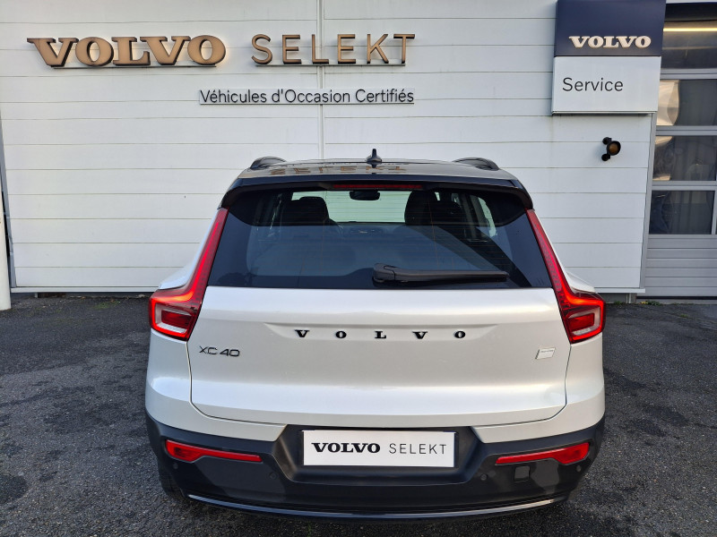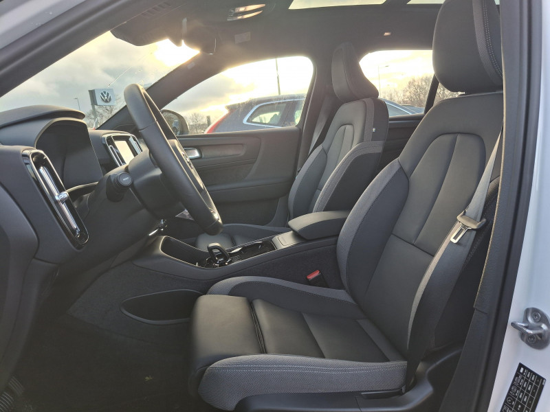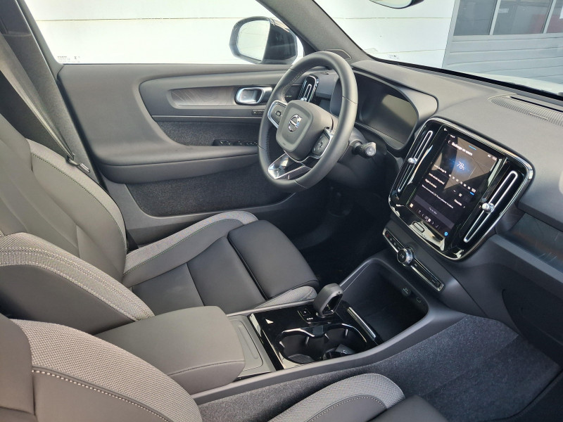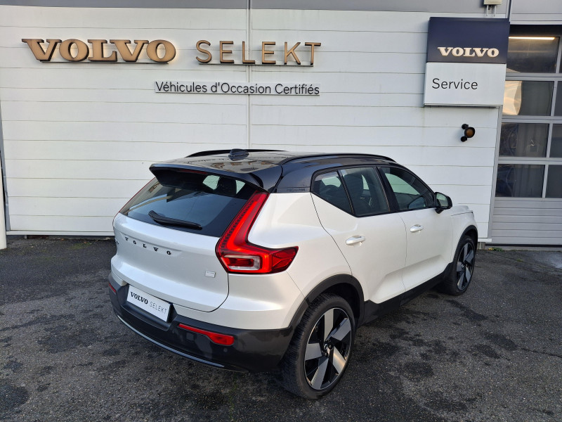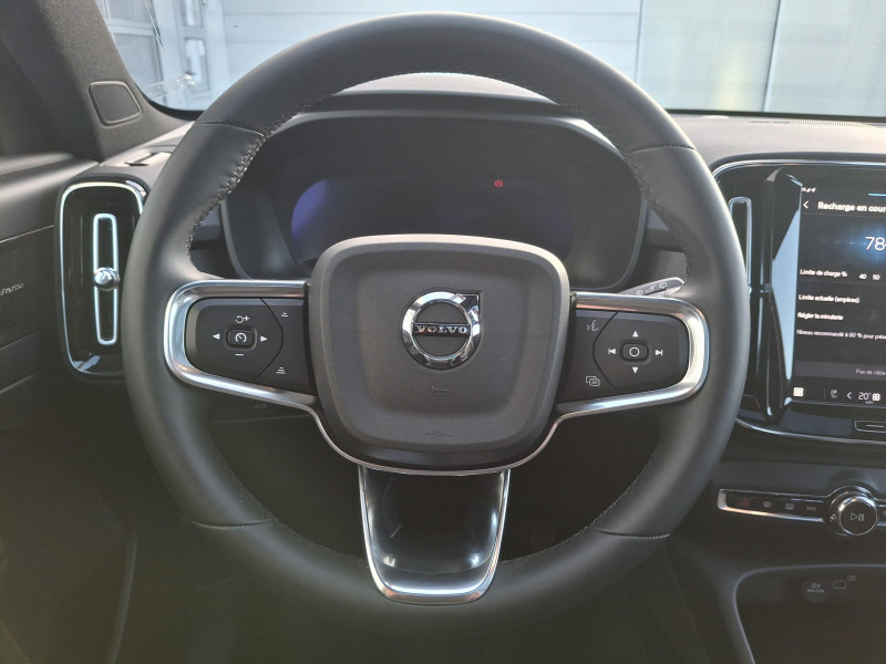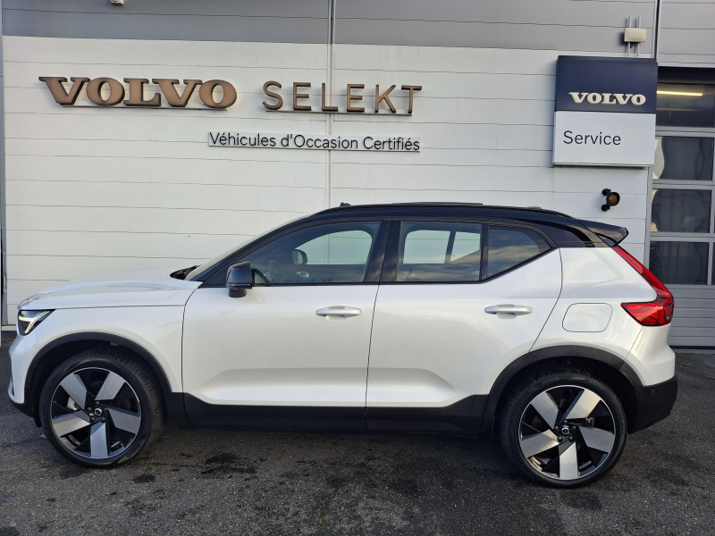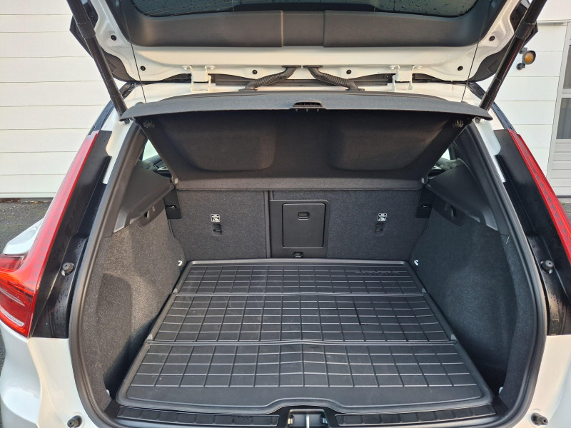Airbag passager désactivable avec témoin d'indication (on/off) / Airbags conducteur et passager à déclenchement différencié / Application Volvo Cars sur smartphone iOS ou Android / Appuie-tête AR rabattables électriquement depuis l'écran central / Assise des sièges AV extensible manuellement / Caméras Surround View (vision panoramique à 360°) incluant caméra AV et caméra de recul / Ceintures de sécuritéà inertie à 3 points d'ancrage (sur les 5 sièges) / CleanZone : Filtre charbon de climatisation multi-actif (limite l'entrée de pollen, de particules de pollution et de mauvaises odeurs en fermant automatiquement les arrivées d'air si nécessaire) et fonction pré-ventillation / Climatisation automatique bi-zone (incluant ouïes d'aération à l'AR) / Déclenchement automatique des feux de detresse lors d'un freinage d'urgence / Ecran tactile multimédia haute résolution 9" personnalisable / Envoi automatique d'une alerte au service d'urgence Volvo en cas de collision / Filet de sécurité derrière la rangée de sièges AV / Fonction climatisation de l'habitacle moteur coupé / Frein de parking électronique automatique en fonction Auto Hold (désactivable) / Freinage automatique post-collision (réduction du risque de suraccident) / Incrustations Aluminium / Infotainment Google Android Services Google (comprend Google Maps, Google Assistant, Google Play Store, chargeur smartphone par induction et un volume de données illimité pour les 4 premières années) et Kit mains libres Bluetooth et Streaming Audio, mode d'emploi numérique du véhicule, réception de la radio numérique (DAB+), mises à jour Over the Air (OTA). / Jantes alliage 19" 5 branches Noir/Diamant AV 235/50 R19, AR 255/45 R19 / Pack Intellisafe Pro / Phares LED avec feux de jour design marteau de Thor et feux de route adaptatifs / Pommeau de levier de vitesse gainé de Simili-Cuir / Pré-câblage électrique pour le crochet d'attelage / Préparation pour le système Isofix (places latérales de la 2ème rangée de sièges) / Seuil de coffre en Aluminium / Seuils de portes AV Volvo en Aluminium / Siège conducteur électrique à mémoires / Siège passager AV à réglages électriques / Sièges conducteur et passager avec réglages électriques des supports lombaires / Système audio Volvo Premium Sound by Harman/Kardon 600 W avec 13 HP et technologie Subwoofer / Système de protection contre le coup du lapin WHIPS (sièges AV) / Toit contrasté noir (sauf teinte Argent Aurore) / Toit ouvrant panoramique en deux parties avec pare-soleil électrique / Télécommande de verrouillage centralisé avec clé de contact intégrée, fermeture à distance des vitres et du toit ouvrant et fonction panique / Verrouillage automatique des portes à partir de 7 km/h / Volant chauffant / Volant sport avec insert Aluminium / 2 porte-cintres / Accès au service d'assistance Volvo via bouton dédié dans le plafonnier / Accès au service d'urgence Volvo via bouton SOS dans le plafonnier / Alerte vigilance conducteur / Assistance à l'évitement des piétons et des cyclistes / Badge Recharge sur le hayon / Bas de caisse et passages de roues Anthracite / Calandre AV pleine couleur carrosserie / City Safety, système d'anticipation de collision intelligent / Coffre sous le capot AV d'une capacité de 31 litres / Combiné d'instruments digital 12,3" / Contrôle de la transmission en descente HDC / Coques de rétroviseurs Noir brillant / Corbeille intégrée et amovible au niveau du tunnel central AV / Crochet pour sacs intégréà la boîte à gants / Câble de recharge Type 2, 4.5 mètres, 32 A triphasé (fonctionne en monophasé) Pour borne de recharge / Diffuseur AR Noir laqué / Direction assistée asservie à la vitesse / Eclairage d'accompagnement et éclairage d'approche / Espace de rangement sous la console centrale / Freins à disques 18" à l'AR / Gravure Recharge sur les montants AR / Indicateur de perte de pression des pneus / IntelliSafe Assist / IntelliSafe Surround / Kit anti-crevaison / Lave-phares à haute pression escamotables / Miroirs de courtoisie éclairés, spots de lecture à l'AV et éclairage dans le coffre / Mise à jour du système à distance / Ouverture des portes sans clé Keyless Entry Eclairage du sol dans les poignées de porte AV + Hayon électrique avec fonction Confort (sans les mains) / Pare-brise en verre feuilleté et colonne de direction rétractable en cas de choc / Parties inférieures des vitres noir brillant / Plancher du coffre rabattable avec crochets / Pneus toutes saison / Pompe à chaleur / Port de recharge sur l'aile AR gauche et connecteur charge rapide (jusqu'à 200 kW) / Porte-cartes bancaires et cartes de services intégré dans la planche de bord / Protections de pare-chocs AV et AR Noir brillant / Rappel d'oubli de bouclage des ceintures de sécurité AV et AR / Réglage en hauteur manuel des ceintures AV / Rétroviseurs couleur carrosserie avec partie inférieure noir / Rétroviseurs intérieur (sans contour) électrochrome / Sabots de protection AV et AR Noir / Sonde de température extérieure et horloge / Système de contrôle de la stabilité et de la traction STC / Système de contrôle du freinage du véhicule VDC / Système de protection anti-sortie de route / Système de protection collision frontale : Détection du risque de collision frontale (de 65 à 140 km/h) avec action corrective sur la direction / Système de protection contre les chocs latéraux SIPS / Système de protection en cas de sortie de route / Système de pré-conditionnement de l'habitacle (chauffage) / Système de réglage en hauteur des phares / Système intelligent d'information au conducteur IDIS / Tapis de sol premium / Trousse de 1er secours et triangle de présignalisation / Tunnel de la console centrale Noir brillant / Verrouillage de sécurité enfant manuel / Vitres AV et AR électriques à impulsion (montée et descente) avec système anti-pincement