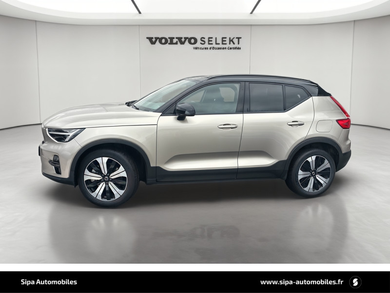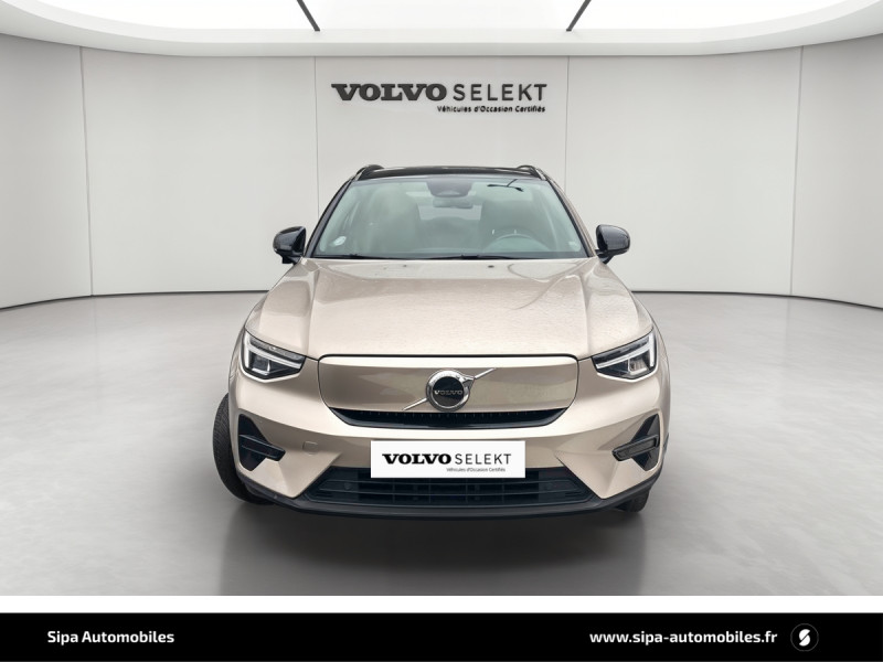 CleanZone : Filtre charbon de climatisation multi-actif (limite l'entrée de pollen, de particules de pollution et de mauvaises odeurs en fermant automatiquement les arrivées d'air si nécessaire) et fonction pré-ventillation / Climatisation automatique bi-zone (incluant ouïes d'aération à l'AR) / Déclenchement automatique des feux de detresse lors d'un freinage d'urgence / Envoi automatique d'une alerte au service d'urgence Volvo en cas de collision / Fonction climatisation de l'habitacle moteur coupé / Frein de parking électronique automatique en fonction Auto Hold (désactivable) / Freinage automatique post-collision (réduction du risque de suraccident) / Incrustations Aluminium / Jantes alliage 19" 5 branches Graphite Mat/Diamant AV 235/50 R19, AR 255/45 R19 / Phares LED avec feux de jour design marteau de Thor et feux de route adaptatifs / Pommeau de levier de vitesse gainé de Simili-Cuir / Pré-câblage électrique pour le crochet d'attelage / Seuil de coffre en Aluminium / Seuils de portes AV Volvo en Aluminium / Télécommande de verrouillage centralisé avec clé de contact intégrée, fermeture à distance des vitres et du toit ouvrant et fonction panique / Verrouillage automatique des portes à partir de 7 km/h / Volant sport avec insert Aluminium / 2 porte-cintres / Accès au service d'assistance Volvo via bouton dédié dans le plafonnier / Accès au service d'urgence Volvo via bouton SOS dans le plafonnier / Airbag passager désactivable avec témoin d'indication (on/off) / Airbags conducteur et passager à déclenchement différencié / Alerte vigilance conducteur / Application Volvo Cars sur smartphone iOS ou Android / Assise des sièges AV extensible manuellement / Assistance à l'évitement des piétons et des cyclistes / Badge Recharge sur le hayon / Bas de caisse et passages de roues Anthracite / Calandre AV pleine couleur carrosserie / Ceintures de sécuritéà inertie à 3 points d'ancrage (sur les 5 sièges) / City Safety, système d'anticipation de collision intelligent / Coffre sous le capot AV d'une capacité de 31 litres / Combiné d'instruments digital 12,3" / Contrôle de la transmission en descente HDC / Coques de rétroviseurs Noir brillant / Corbeille intégrée et amovible au niveau du tunnel central AV / Crochet pour sacs intégréà la boîte à gants / Câble de recharge de 7 mètres / 10 A. Pour prise secteur / Deuxième câble de recharge Type 2, 4.5 mètres, 32 A triphasé (fonctionne en monophasé) Pour borne de recharge / Diffuseur AR Noir laqué / Direction assistée asservie à la vitesse / Eclairage d'accompagnement et éclairage d'approche / Ecran tactile multimédia haute résolution 9" personnalisable / Espace de rangement sous la console centrale / Fonction Eco : optimisation des paramètres véhicule pour une conduite économique et écologique (à la demande) / Gravure Recharge sur les montants AR / Indicateur de perte de pression des pneus / Infotainment Google Android Services Google (comprend Google Maps, Google Assistant, Google Play Store, chargeur smartphone par induction et un volume de données illimité pour les 4 premières années) et Kit mains libres Bluetooth et Streaming Audio, mode d?emploi numérique du véhicule, réception de la radio numérique (DAB+), mises à jour Over the Air (OTA). / Kit anti-crevaison / Matériaux anti-allergènes dans l'habitacle (sellerie tissu, ceintures de sécurité, incrustations) / Miroirs de courtoisie éclairés, spots de lecture à l'AV et éclairage dans le coffre / Mise à jour du système à distance / Pare-brise en verre feuilleté et colonne de direction rétractable en cas de choc / Parties inférieures des vitres noir brillant / Pneus toutes saison / Port de recharge sur l'aile AR gauche et connecteur charge rapide (jusqu'à 150 kW) / Porte-cartes bancaires et cartes de services intégré dans la planche de bord / Protections de pare-chocs AV et AR Noir brillant / Préparation pour le système Isofix (places latérales de la 2ème rangée de sièges) / Rappel d'oubli de bouclage des ceintures de sécurité AV et AR / Réglage en hauteur manuel des ceintures AV / Rétroviseurs couleur carrosserie avec partie inférieure noir / Rétroviseurs intérieur (sans contour) et extérieur électrochrome / Sabots de protection AV et AR Noir / Siège conducteur et passager avec réglage manuel de la hauteur / Sièges conducteur et passager avec réglage manuel de la longueur, de l'inclinaison du dossier et de l'assise / Sièges conducteur et passager avec réglages électriques des supports lombaires / Sonde de température extérieure et horloge / Système audio Volvo High Performance avec technologie air woofer au niveau de la console centrale 250 W, 8 HP, radio numérique terrestre, prise 12 V et 2 ports USB C à l'AV / Système de contrôle de la stabilité et de la traction STC / Système de contrôle du freinage du véhicule VDC / Système de protection anti-sortie de route / Système de protection collision frontale : Détection du risque de collision frontale (de 65 à 140 km/h) avec action corrective sur la direction / Système de protection contre le coup du lapin WHIPS (sièges AV) / Système de protection contre les chocs latéraux SIPS / Système de protection en cas de sortie de route / Système de pré-conditionnement de l'habitacle (chauffage) / Système de réglage en hauteur des phares / Système intelligent d'information au conducteur IDIS / Tapis de sol premium / Trousse de 1er secours et triangle de présignalisation / Tunnel de la console centrale Noir brillant / Verrouillage de sécurité enfant manuel / Vitres AV et AR électriques à impulsion (montée et descente) avec système anti-pincement