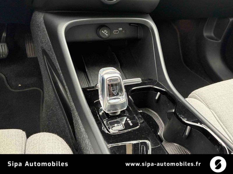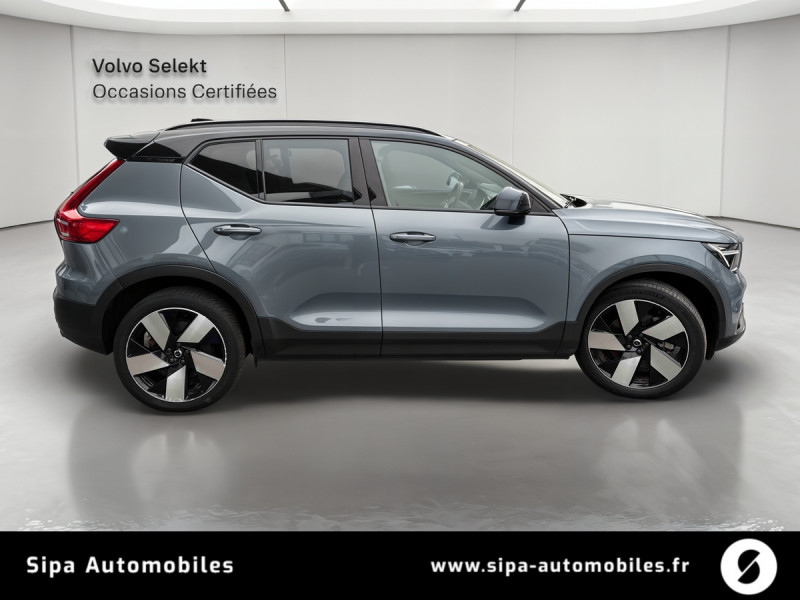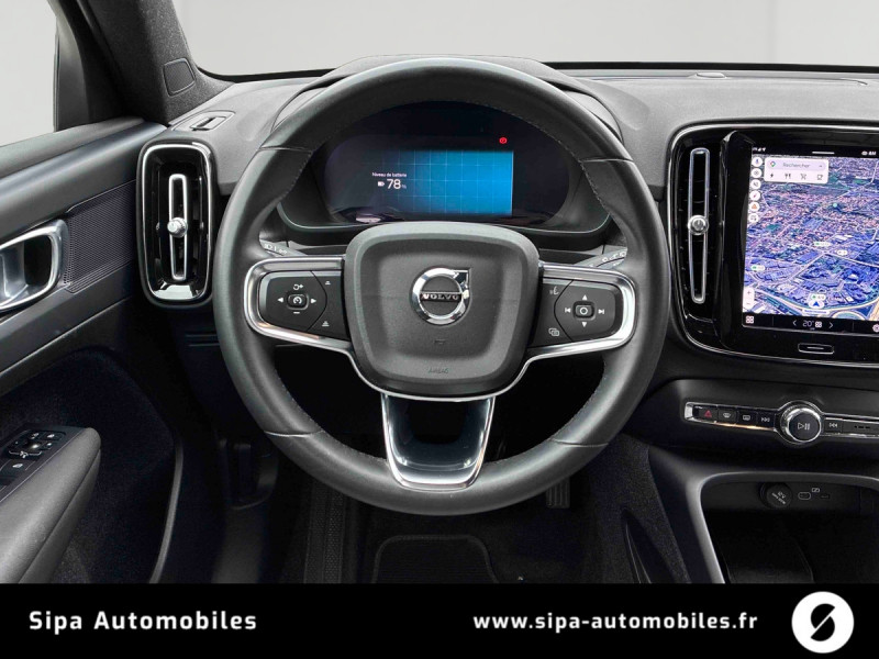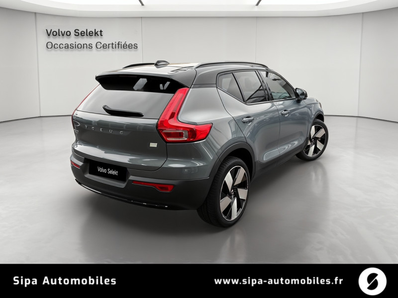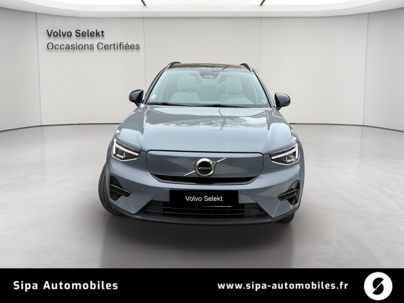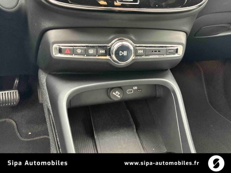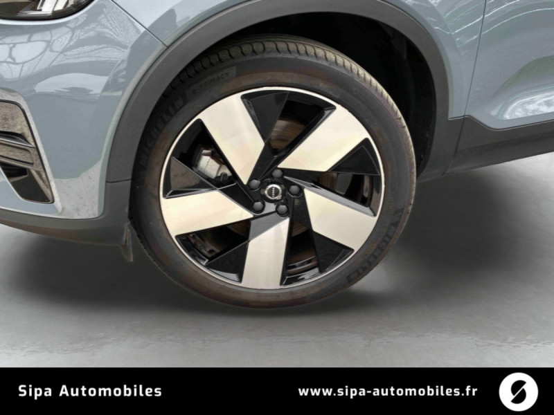 CleanZone : Filtre charbon de climatisation multi-actif (limite l'entrée de pollen, de particules de pollution et de mauvaises odeurs en fermant automatiquement les arrivées d'air si nécessaire) et fonction pré-ventillation / Climatisation automatique bi-zone (incluant ouïes d'aération à l'AR) / Déclenchement automatique des feux de detresse lors d'un freinage d'urgence / Envoi automatique d'une alerte au service d'urgence Volvo en cas de collision / Fonction climatisation de l'habitacle moteur coupé / Frein de parking électronique automatique en fonction Auto Hold (désactivable) / Freinage automatique post-collision (réduction du risque de suraccident) / Incrustations Aluminium / Jantes alliage 19" 5 branches Graphite Mat/Diamant AV 235/50 R19, AR 255/45 R19 / Phares LED avec feux de jour design marteau de Thor et feux de route adaptatifs / Pommeau de levier de vitesse gainé de Simili-Cuir / Pré-câblage électrique pour le crochet d'attelage / Seuil de coffre en Aluminium / Seuils de portes AV Volvo en Aluminium / Télécommande de verrouillage centralisé avec clé de contact intégrée, fermeture à distance des vitres et du toit ouvrant et fonction panique / Verrouillage automatique des portes à partir de 7 km/h / Volant sport avec insert Aluminium / 2 porte-cintres / Accès au service d'assistance Volvo via bouton dédié dans le plafonnier / Accès au service d'urgence Volvo via bouton SOS dans le plafonnier / Airbag passager désactivable avec témoin d'indication (on/off) / Airbags conducteur et passager à déclenchement différencié / Alerte vigilance conducteur / Application Volvo Cars sur smartphone iOS ou Android / Assise des sièges AV extensible manuellement / Assistance à l'évitement des piétons et des cyclistes / Badge Recharge sur le hayon / Bas de caisse et passages de roues Anthracite / Calandre AV pleine couleur carrosserie / Ceintures de sécuritéà inertie à 3 points d'ancrage (sur les 5 sièges) / City Safety, système d'anticipation de collision intelligent / Coffre sous le capot AV d'une capacité de 31 litres / Combiné d'instruments digital 12,3" / Contrôle de la transmission en descente HDC / Coques de rétroviseurs Noir brillant / Corbeille intégrée et amovible au niveau du tunnel central AV / Crochet pour sacs intégréà la boîte à gants / Câble de recharge de 7 mètres / 10 A. Pour prise secteur / Deuxième câble de recharge Type 2, 4.5 mètres, 32 A triphasé (fonctionne en monophasé) Pour borne de recharge / Diffuseur AR Noir laqué / Direction assistée asservie à la vitesse / Eclairage d'accompagnement et éclairage d'approche / Ecran tactile multimédia haute résolution 9" personnalisable / Espace de rangement sous la console centrale / Fonction Eco : optimisation des paramètres véhicule pour une conduite économique et écologique (à la demande) / Gravure Recharge sur les montants AR / Indicateur de perte de pression des pneus / Infotainment Google Android Services Google (comprend Google Maps, Google Assistant, Google Play Store, chargeur smartphone par induction et un volume de données illimité pour les 4 premières années) et Kit mains libres Bluetooth et Streaming Audio, mode d?emploi numérique du véhicule, réception de la radio numérique (DAB+), mises à jour Over the Air (OTA). / Kit anti-crevaison / Matériaux anti-allergènes dans l'habitacle (sellerie tissu, ceintures de sécurité, incrustations) / Miroirs de courtoisie éclairés, spots de lecture à l'AV et éclairage dans le coffre / Mise à jour du système à distance / Pare-brise en verre feuilleté et colonne de direction rétractable en cas de choc / Parties inférieures des vitres noir brillant / Pneus toutes saison / Port de recharge sur l'aile AR gauche et connecteur charge rapide (jusqu'à 150 kW) / Porte-cartes bancaires et cartes de services intégré dans la planche de bord / Protections de pare-chocs AV et AR Noir brillant / Préparation pour le système Isofix (places latérales de la 2ème rangée de sièges) / Rappel d'oubli de bouclage des ceintures de sécurité AV et AR / Réglage en hauteur manuel des ceintures AV / Rétroviseurs couleur carrosserie avec partie inférieure noir / Rétroviseurs intérieur (sans contour) et extérieur électrochrome / Sabots de protection AV et AR Noir / Siège conducteur et passager avec réglage manuel de la hauteur / Sièges conducteur et passager avec réglage manuel de la longueur, de l'inclinaison du dossier et de l'assise / Sièges conducteur et passager avec réglages électriques des supports lombaires / Sonde de température extérieure et horloge / Système audio Volvo High Performance avec technologie air woofer au niveau de la console centrale 250 W, 8 HP, radio numérique terrestre, prise 12 V et 2 ports USB C à l'AV / Système de contrôle de la stabilité et de la traction STC / Système de contrôle du freinage du véhicule VDC / Système de protection anti-sortie de route / Système de protection collision frontale : Détection du risque de collision frontale (de 65 à 140 km/h) avec action corrective sur la direction / Système de protection contre le coup du lapin WHIPS (sièges AV) / Système de protection contre les chocs latéraux SIPS / Système de protection en cas de sortie de route / Système de pré-conditionnement de l'habitacle (chauffage) / Système de réglage en hauteur des phares / Système intelligent d'information au conducteur IDIS / Tapis de sol premium / Trousse de 1er secours et triangle de présignalisation / Tunnel de la console centrale Noir brillant / Verrouillage de sécurité enfant manuel / Vitres AV et AR électriques à impulsion (montée et descente) avec système anti-pincement