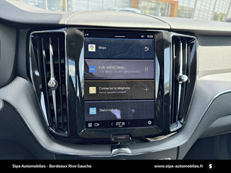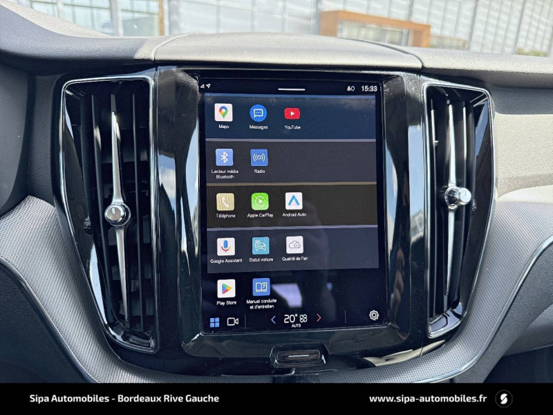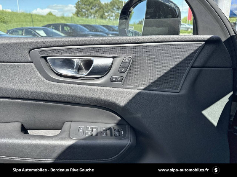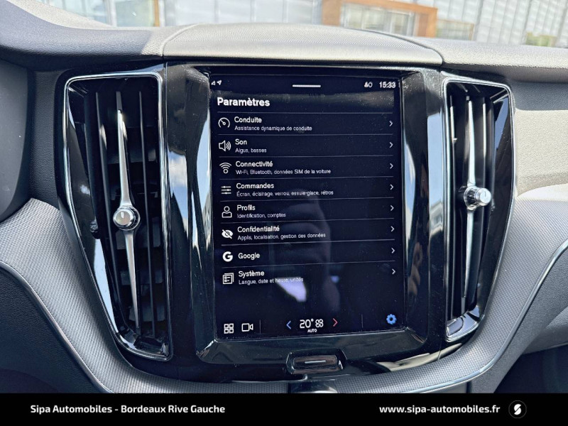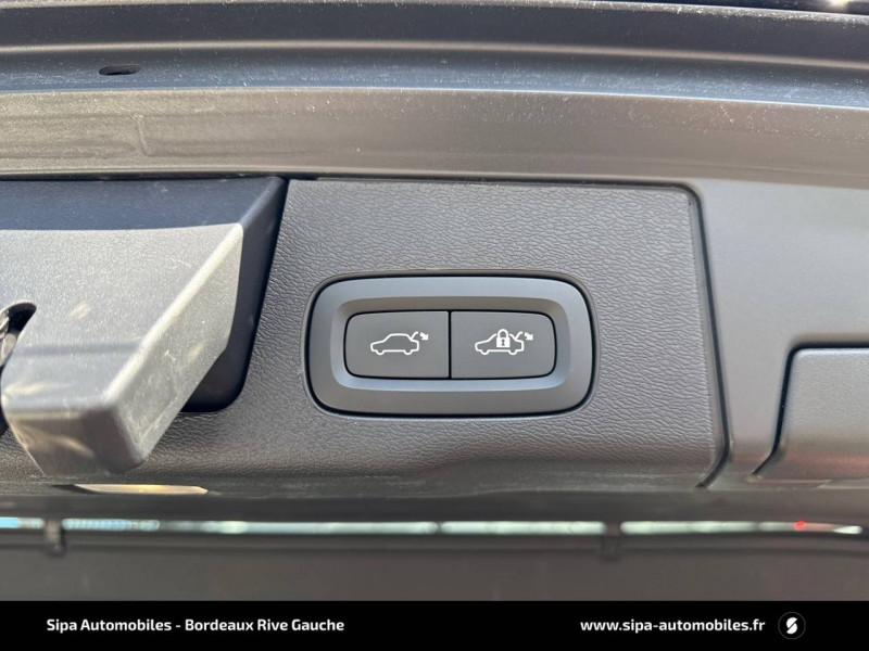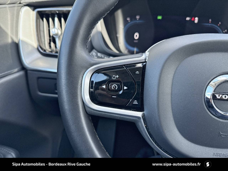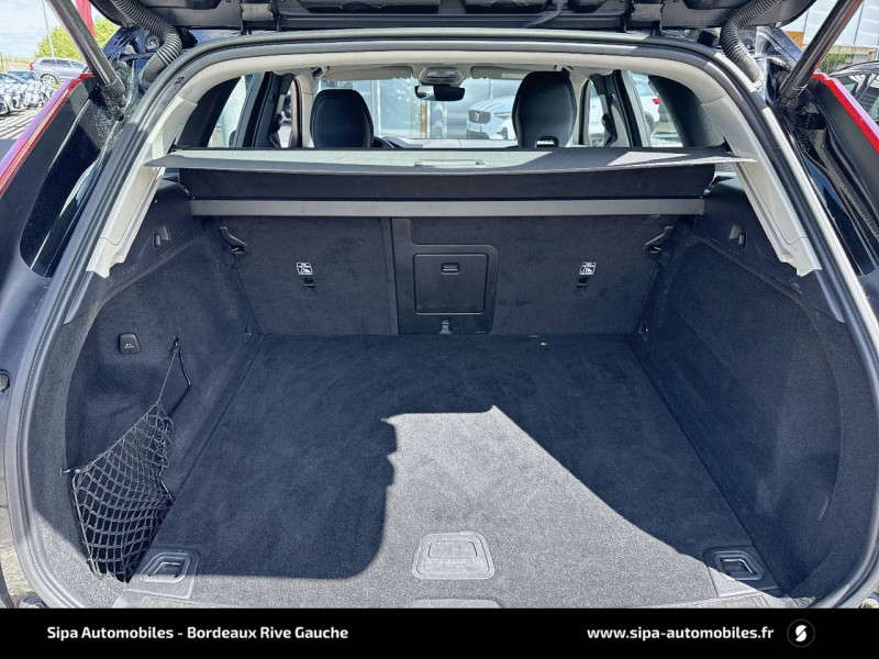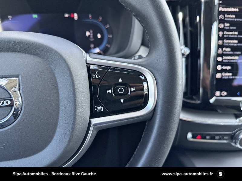 2 prises USB type-C / 4 points d'ancrage dans les panneaux latéraux du compartiment à bagages / Accès au service d'assistance Volvo via bouton dédié dans le plafonnier / Accès au service d'urgence Volvo via bouton SOS dans le plafonnier / Airbag passager désactivable avec témoin d'indication (on/off) / Airbags conducteur et passager à déclenchement différencié / Alerte Distraction Trafic (Ready to drive notification) / Alerte vigilance conducteur / Application Volvo Cars / Assise des sièges AV extensible (électriquement si le siège dispose des réglages électriques) / Assise et dossier des sièges en Cuir coloris Noir / Calandre avec contour chromé et inserts verticaux Noir Laqué et chromés / Ceintures de sécuritéà inertie à 3 points d'ancrage tous les sièges / Châssis Dynamique / City Safety (ou Safety Assistance) Système d'anticipation de collision intelligent / CleanZone Advanced : système de filtration de l'air avancé / Climatisation automatique bi-zone Inclut un système de recirculation de l'air et un filtre à pollen / Combiné d'instruments digital 12,3" nouvelle génération / Commande vocale avancée (climatisation, médias, téléphone, eManuel utilisateur et navigation) / Contour des vitres latérales chromé / Contrôle de la transmission en descente HDC / Déclenchement automatique des feux de detresse lors d'un freinage d'urgence / Direction assistée électrique asservie à la vitesse / Eclairage d'accompagnement et éclairage d'approche / Ecran central tactile multimédia haute résolution 9" personnalisable, nouvelle génération / Envoi automatique d'une alerte au service en cas de collision / Filet de protection coffre/habitacle / Fonction climatisation de l'habitacle moteur coupé / Fonction Stop&Start : coupe et redémarre le moteur lorsque la voiture est à l'arrêt (déconnectable) / Freinage automatique post-collision (réduction du risque de suraccident) / Freins à disques 18" ventilés à l'AV, 17" à l'AR / Indicateur de perte de pression des pneus / Infotainment Google Android Services Google (comprend Google Maps, Google Assistant, Google Play Store, chargeur smartphone par induction et un volume de données illimité pour les 4 premières années) et Kit mains libres Bluetooth et Streaming Audio, mode d'emploi numérique du véhicule, réception de la radio numérique (DAB+), mises à jour Over the Air (OTA). / Insert chromé sur le bouclier AR / Insert chromé sur le bouclier AV / Insert chromé sur les bas de caisse latéraux / Jantes alliage 19" 5 branches en V Noir / Diamant, 235/55 R19 / Kit anti-crevaison / Miroirs de courtoisie éclairés, spots de lecture à l'AV, éclairage aux pieds à l'AV, dans la boîte à gants et le coffre, éclairage intérieur temporisé / Mise à jour du système à distance (Over The Air ou OTA) / Mode de conduite personnalisable Impactant direction, moteur, freins, ESC, Stop & Start, économies d'énergie, combiné digital et contrôle actif du bruit) / Ouverture des portes sans clé Keyless Entry incluant éclairage du sol dans les poignées de porte AV et ouverture Confort du hayon électrique (sans les mains) / Pack Digital Connect / Pack éclairage / Pare-brise en verre feuilleté et colonne de direction rétractable en cas de choc / Pare-chocs AR avec sorties d'échappement dissimulées / Pare-chocs AV couleur carrosserie avec inserts chromés / Pavillon de toit coloris Beige / Phares LED avec correcteur dynamique de la portée et feux de jour design marteau de Thor / Pommeau de levier de vitesse gainé de Simili-Cuir / Porte-ticket de parking et d'autoroute / Pré-câblage électrique pour le crochet d'attelage / Préparation pour le système Isofix (places latérales de la 2ème rangée de sièges) / Prise 12 V dans le coffre / Radar de stationnement AV et AR avec signal sonore et visuel / Rails de toit Chrome / Rappel d'oubli de bouclage de ceinture de sécurité AV et AR / Rétroviseurs extérieurs couleur carrosserie / Rétroviseurs intérieur sans contour et extérieurs électrochromes / Sécurité connectée Alerte Feux de détresse et Chaussée glissante (nécessite une connexion Internet) / Sellerie Cuir avec Sièges confort / Seuil de coffre en Aluminium / Seuils de porte en Aluminium à l'AV badgés Volvo / Siège conducteur à réglages électriques et à mémoire / Siège passager AV à réglages électriques / Siège passager avec fonction mémoire / Sonde de température extérieure et horloge / Structure de l'habitacle renforcéà l'acier de Bore / Supports lombaires des sièges AV réglables électriquement (4 positions) / Système Alerte Trafic en marche AR avec freinage automatique en cas de danger (Rear auto brake) / Système audio Volvo High Performance, 220 W, 10 HP, radio RDS / Système de contrôle de la stabilité et de la traction STC / Système de contrôle du freinage du véhicule VDC / Système de protection anti-sortie de route / Système de protection collision frontale : Détection du risque de collision frontale (jusqu'à 80 km/h) avec action corrective sur la direction / Système de protection en cas de sortie de route / Système de récupération de l'énergie au freinage / Système de réglage en hauteur des phares / Système intelligent d'information au conducteur IDIS / Tapis de sol textile AV/AR / Télécommande de verrouillage centralisé avec clé de contact integrée, fermeture automatique des vitres et du toit ouvrant, fonction panique (déclenchement du klaxon et des feux de détresse) / Trappe de carburant intelligente sans bouchon / Trousse de 1er secours et triangle de présignalisation / Verrouillage automatique des portes à partir de 7 km/h / Verrouillage de sécurité enfant automatique commandé depuis le siège conducteur (condamne aussi les fenêtres AR) / Vitres AV et AR électriques à impulsion (montée et descente) avec système anti-pincement / Volant 3 branches gainé de Simili-Cuir
