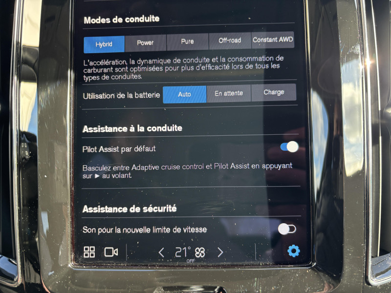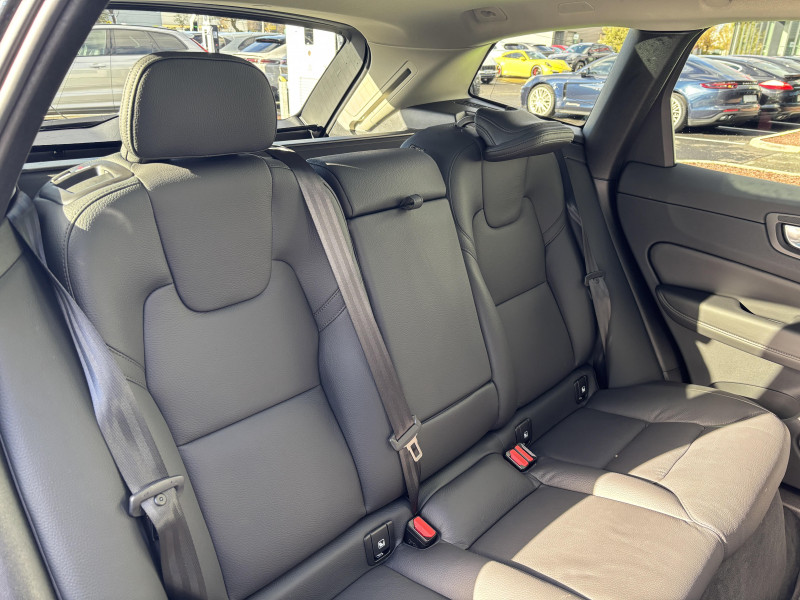 Assise et dossier des sièges en Cuir coloris Noir / Climatisation automatique bi-zone Inclut un système de recirculation de l?air et un filtre à pollen / Commande vocale avancée (climatisation, médias, téléphone, eManuel utilisateur et navigation) / Câble de recharge de 4,5 mètres avec LED d'indication de charge / Déclenchement automatique des feux de detresse lors d'un freinage d'urgence / Envoi automatique d?une alerte au service en cas de collision / Fonction climatisation de l'habitacle moteur coupé / Freinage automatique post-collision (réduction du risque de suraccident) / Incrustations Aluminium Maillé / Jantes alliage 19" 5 branches double Noir/Diamant 235/55 R19 / Pack Digital Connect / Phares LED avec correcteur dynamique de la portée et feux de jour design marteau de Thor / Pommeau de levier de vitesse gainé de Simili-Cuir / Pré-câblage électrique pour le crochet d'attelage / Radar de stationnement AV et AR avec signal sonore et visuel / Sellerie Cuir avec Sièges confort / Seuil de coffre en Aluminium / Seuils de porte en Aluminium à l'AV badgés Volvo / Seuils de portes en Aluminium à l'AV badgés Recharge / Système de pré-conditionnement de l'habitacle (chauffage et climatisation) / Toit ouvrant panoramique en deux parties avec pare-soleil électrique / Télécommande de verrouillage centralisé avec clé de contact integrée, fermeture automatique des vitres et du toit ouvrant, fonction panique (déclenchement du klaxon et des feux de détresse) / Verrouillage automatique des portes à partir de 7 km/h / Verrouillage de sécurité enfant automatique commandé depuis le siège conducteur (condamne aussi les fenêtres AR) / Volant 3 branches gainé de Simili-Cuir / 2 prises USB type-C / 4 points d'ancrage dans les panneaux latéraux du compartiment à bagages / Accès au service d'assistance Volvo via bouton dédié dans le plafonnier / Accès au service d'urgence Volvo via bouton SOS dans le plafonnier / Airbag passager désactivable avec témoin d'indication (on/off) / Airbags conducteur et passager à déclenchement différencié / Alerte Distraction Trafic (Ready to drive notification) / Alerte vigilance conducteur / Application Volvo Cars sur smartphone iOS ou Android / Appuie-tête AR rabattables électriquement / Assise des sièges AV extensible (électriquement si le siège dispose des réglages électriques) / Bouclier AV et diffuseur AR spécifiques avec inserts Noir Laqué / Calandre spécifique avec incrustations et contour Noir Laqué / Ceintures de sécuritéà inertie à 3 points d'ancrage tous les sièges / Châssis Dynamique / City Safety (ou Safety Assistance) Système d?anticipation de collision intelligent / Combiné d'instruments digital 12,3" nouvelle génération / Contour des vitres latérales Noir laqué / Contrôle de la transmission en descente HDC / Coques de rétroviseurs Noir Laqué / Direction assistée électrique asservie à la vitesse / Eclairage d'accompagnement et éclairage d'approche / Ecran central tactile multimédia haute résolution 9" personnalisable, nouvelle génération / Filet de protection coffre/habitacle / Fonction Stop&Start : coupe et redémarre le moteur lorsque la voiture est à l'arrêt (déconnectable) / Freins à disques 18" ventilés à l'AV, 17" à l'AR / Indicateur de perte de pression des pneus / Infotainment Google Android Services Google (comprend Google Maps, Google Assistant, Google Play Store, chargeur smartphone par induction et un volume de données illimité pour les 4 premières années) et Kit mains libres Bluetooth et Streaming Audio, mode d?emploi numérique du véhicule, réception de la radio numérique (DAB+), mises à jour Over the Air (OTA). / Inserts Noir Laqué sur le bouclier AV et AR / Kit anti-crevaison / Miroirs de courtoisie éclairés, spots de lecture à l'AV, éclairage aux pieds à l'AV, dans la boîte à gants et le coffre, éclairage intérieur temporisé / Mise à jour du système à distance (Over The Air ou OTA) / Mode de conduite personnalisable : Pure, Hybrid, Power, AWD, Off Road Impactant direction, moteur, freins, ESC, Stop & Start, économies d?énergie, combiné digital et contrôle actif du bruit) / One Pedal Drive ou Conduite à une pédale Fonction permettant au conducteur de contrôler à la fois l?accélération et la décélération avec la seule pédale d?accélérateur / Ouverture des portes sans clé Keyless Entry incluant éclairage du sol dans les poignées de porte AV et ouverture Confort du hayon électrique (sans les mains) / Pare-brise en verre feuilleté et colonne de direction rétractable en cas de choc / Pare-chocs AR avec sorties d?échappement dissimulées / Pare-chocs AV couleur carrosserie avec inserts chromés / Pavillon de toit coloris Beige / Port de recharge sur l'aile AV gauche / Porte-ticket de parking et d'autoroute / Prise 12 V dans le coffre / Préparation pour l'installation d'un éthylomètre antidémarrage / Préparation pour le système Isofix (places latérales de la 2ème rangée de sièges) / Purificateur d'air CleanZone Avancé Système de filtration de l'air avancé avec indication de la qualité de l'air / Rails de toit couleur Noir Laqué / Rappel d'oubli de bouclage de ceinture de sécurité AV et AR / Rétroviseurs extérieurs couleur carrosserie / Rétroviseurs intérieur sans contour et extérieurs électrochromes / Siège conducteur à réglages électriques et à mémoire / Siège passager AV à réglages électriques / Siège passager avec fonction mémoire / Sonde de température extérieure et horloge / Structure de l'habitacle renforcéà l'acier de Bore / Subwoofer / Supports lombaires des sièges AV réglables électriquement (4 positions) / Système audio Volvo High Performance, 220 W, 10 HP, radio RDS / Système de contrôle de la stabilité et de la traction STC / Système de contrôle du freinage du véhicule VDC / Système de protection anti-sortie de route / Système de protection collision fro